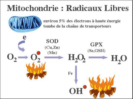 Par contre, si ce fonctionnement est perturbé notamment par une insuffisance de sélénium ou une superoxyde dismutase trop activée, l'eau oxygénée s'accumule et, spontanément, va arracher un électron à un atome comme, par exemple, le fer ferreux qui va se transformer en fer ferrique. L'eau oxygénée se transforme alors en radical hydroxyle, une des entités moléculaires les plus dangereuses auxquelles nos cellules sont confrontées. Le radical hydroxyle va oxyder l'ADN, ce qui conduira à des mutations, altérant ainsi les acides gras polyinsaturés en les transformant en lipoperoxydes toxiques,… Toute mauvaise gestion de la production des radicaux libres par les mitochondries conduit donc potentiellement à des catastrophes.